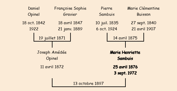 Epouse : Marie Henriette Sambuis (21 ans, née le 25 avril1876 à Maison Blanche, domestique à Calluire et Cuire 31 rue du Belvédère (Rhône), a signé), fille de Pierre (cultivateur à La Maison Blanch, a signé) et de Marie Clémentine Buisson (cultivatrice, n'a pas su signer) |