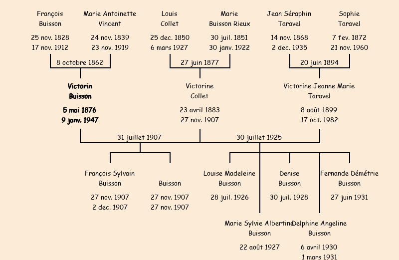 Epoux : Victorin Buisson (31 ans, né à Charvin le 5 mai1876), fils de François (79 ans, de Charvin) et de Marie Antoinette Vincent (67 ans, de Charvin) |