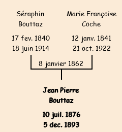 Père : Séraphin Bouttaz, fils de Saturnin (cultivateur, 36 ans) | Parrain : Jean Pierre Bouttaz |