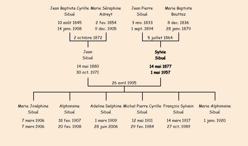 Epouse : Sylvie Sibué (27 ans, née le 14 mai1877 à Fontcouverte), fille de Jean Pierre (décédé à Fontcouverte le 1er septembre1894) et de Marie Baptiste Bouttaz (décédée à Fontcouverte le 28 janvier 1879) |
