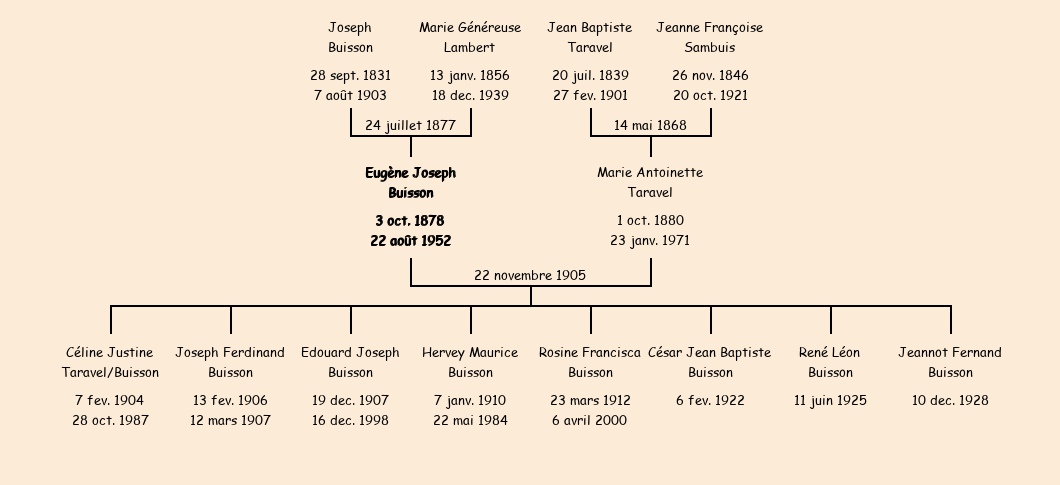 | Epoux : Eugène Joseph Buisson (27 ans, né le 3 octobre1878 à Charvin), fils de Joseph (décédé le 7 août1903 à Charvin) et de Geneviève Lambert (50 ans, de Charvin) |