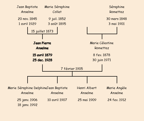 Epoux : Jean Pierre Anselme (26 ans, né le 15 avril1879 aux Anselmes, charpentier, domicilié à Saint Jean de Maureinne), fils de Jean Baptiste et de Marie Séraphine Collet (née et décédée aux Anselmes le 3 août1895) |