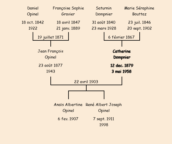Epoux : Jean François Opinel (25 ans né le 23 août1877 à Albiez le Vieux hameau de Gévoudaz), fils de Daniel (cultivateur à Gévoudaz) et de Françoise Gravier (décédée le 21 janvier 1889) |