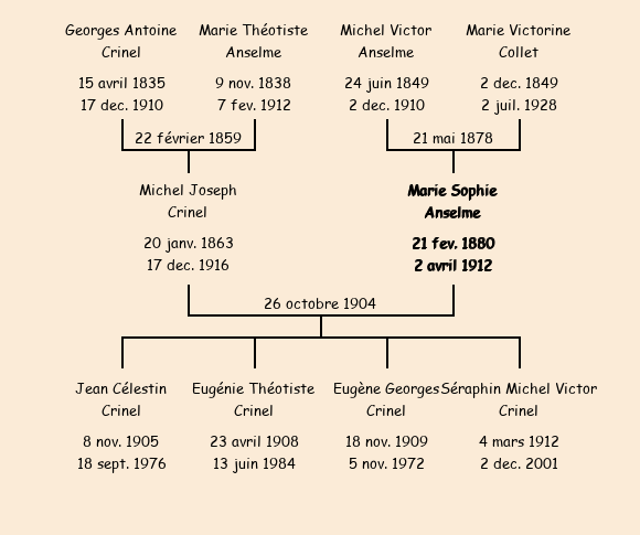Epouse : Marie Sophie Anselme (24 ans, née aux Anselmes le 21 février1880), fille de Michel Victor et de Marie Victorine Collet |