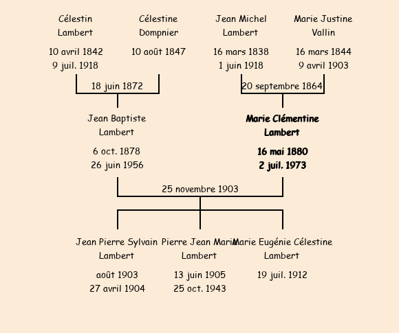 Epouse : Marie Clémentine Lambert (23 ans, née le 16 mai1880 au Villard), fille de Jean Michel et de Marie Justine Vallin (décédée au Villard le 9 avril1903) |