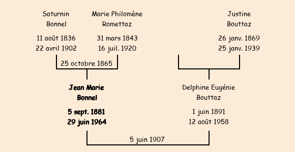 Epouse : Delphine Eugénie Bouttaz (16 ans, née à Pierre Pin le 1er juin1891), fille de Justine Bouttaz (39 ans) |