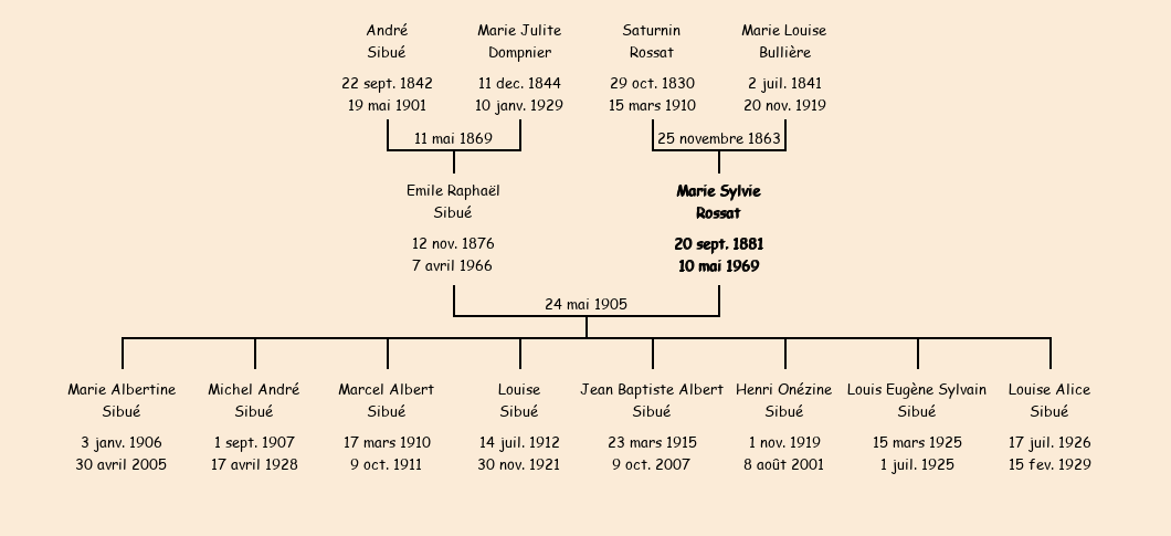 Epoux : Emile Raphaël Sibué (28 ans, né le 12 novembre1876 à la Bise), fils de André (décédé à la Bise le 19 mai1901) et de Julite Dompnier |