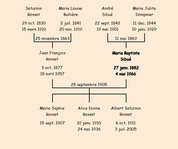 Epouse : Marie Baptiste Sibué (23 ans, née le 27 janvier 1882 à La Bise), fille de André (décédé à la Bise le 19 mai1901) et de Marie Julite Dompnier (59 ans, domiciliée à La Bise) |