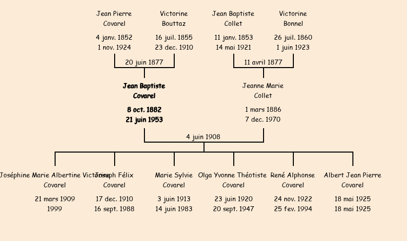 Epoux : Jean Baptiste Covarel (25 ans, né le 8 octobre1882 à La Rochette), fils de Jean Pierre (56 ans, domicilié à La Rochette) et de Victorine Bouttaz (52 ans, domiciliée à La Rochette) |