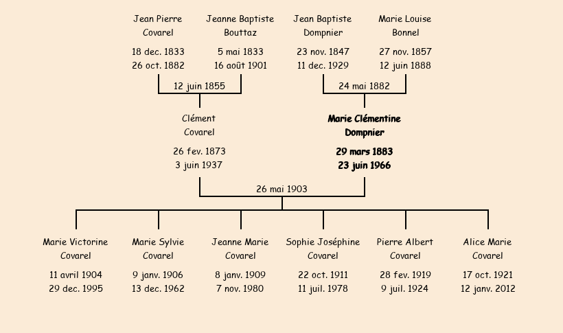 Epoux : Clément Covarel (30 ans né le 26 février1873 à La Rochette), fils de Jean Pierre (décédé à la Rochette le 26 octobre1892) et de Jeanne Baptiste Bouttaz (décédée le 16 août1901 à la Rochette) |