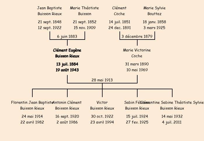 Epoux : Clément Eugène Buisson Rieux (né à Fontcouverte le 13 juillet1884, domicilié à l'Alpettaz), fils de Jean Baptiste (de L'Alpettaz) et de feue Marie Théotiste Buisson |