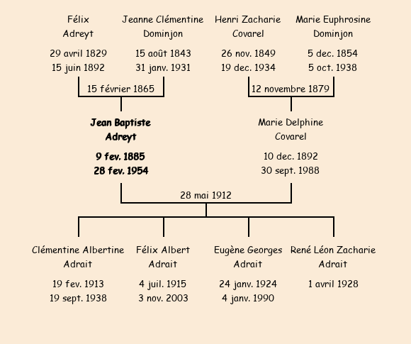 Epoux : Jean Baptiste Adrait (27 ans, né le 9 février1885 à la Rochette et domicilié à la Rochette), fils de Félix (décédé à La Rochette le 15 juin1891) et de Clémentine Dominjon (77 ans, domiciliée à la Rochette) |