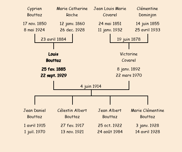 | Epoux : Louis Bouttaz (né à Fontcouverte le 25 février1885, domicilié à La Bettaz), fils de Cyprien (de La Bettaz) et de Marie Catherine Roche (de La Bettaz) |