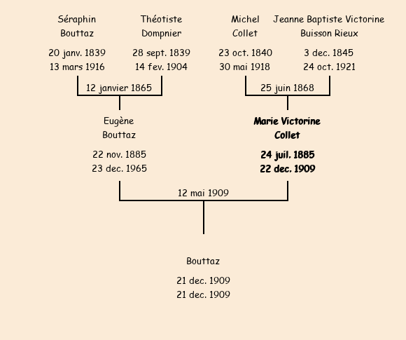 Epoux : Eugène Bouttaz (24 ans, né à la Bize le 22 novembre1885), fils de Séraphin (vivant (70 ans)) et de Théotiste Dompnier (décédée à la Bize le 4 février1904) |