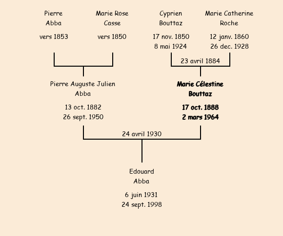 | Epoux : Pierre Auguste Jullien Abba (47 ans, né à Exilles, province de Turin (Italie) le 13 octobre1882, domicilié au Suel, veuf de Marie Delphine Claraz Bonnel depuis le 20 mai1928), fils de feu Pierre et de feue Marie Rose Casse |