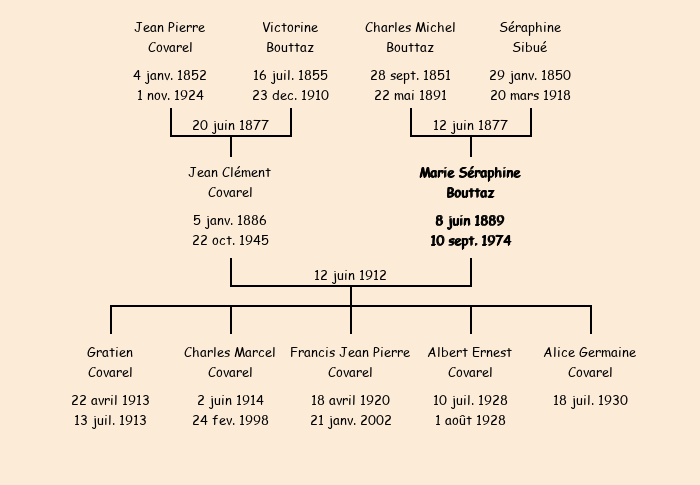 Epoux : Jean Clément Covarel (26 ans, né le 5 janvier 1886 à la Rochette et domcilié à la Rochette,), fils de Jean Pierre (59 ans, de La Rochette) et de Victorine Bouttaz (décédée à a Rochette le 23 décembre1910) |