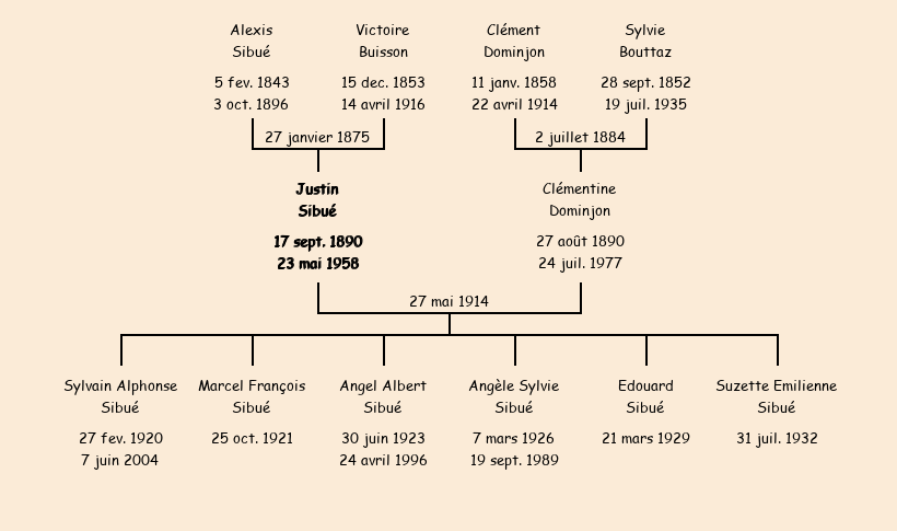 | Epoux : Justin Sibué (né à Fontcouverte le 17 septembre1890, domicilié à Pierre Pin Dessus), fils de feu Alexis et de Victorine Buisson (de Pierre Pin Dessus) |