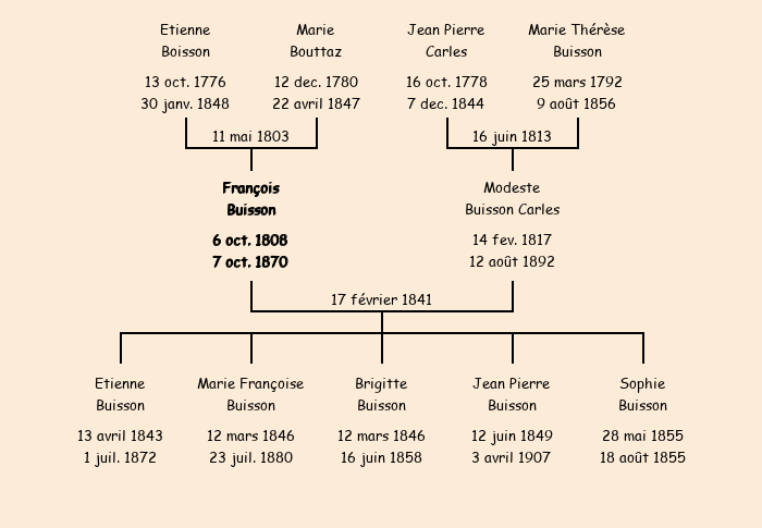 Epouse : Marie Modeste Carles (25 ans, a marqué), fille de Jean Pierre (a marqué) et de Marie Thérèse Buisson |