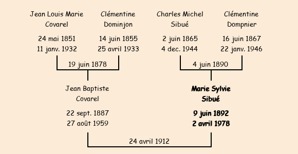 Epouse : Marie Sylvie Sibué (20 ans, née à Fontcouverte le 9 juin1892), fille de Charles Michel (47 ans, de La Maison Blanche) et de Clémentine Dompnier (45 ans) |