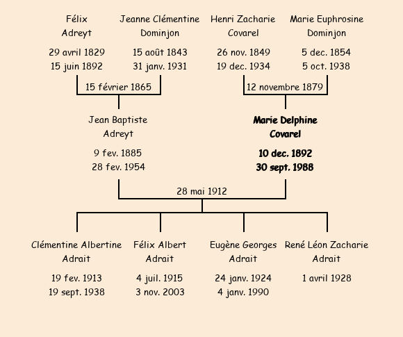 Epoux : Jean Baptiste Adrait (27 ans, né le 9 février1885 à la Rochette et domicilié à la Rochette), fils de Félix (décédé à La Rochette le 15 juin1891) et de Clémentine Dominjon (77 ans, domiciliée à la Rochette) |
