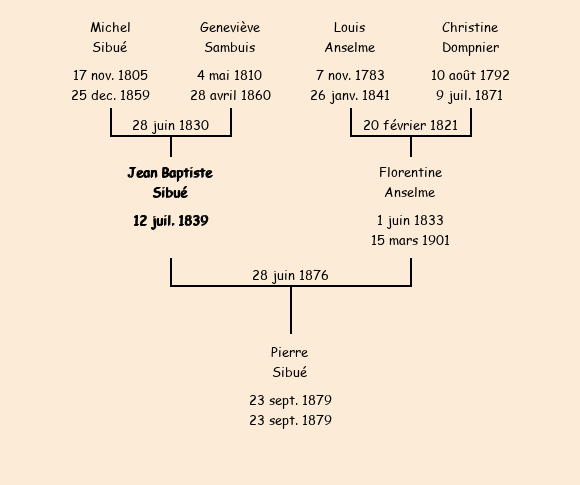 Epoux : Jean Baptiste Sibué (37 ans, né le 12 juillet1839 à La Bize, cultivateur à La Bize, a signé), fils de Michel (décédé le 25 décembre1859) et de Geneviève Sambuis (décédée le 29 avril1860) |