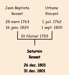 Père : Jean Baptiste Rossat, fils de François | Parrain : Saturnin Vincent (fils de Michel, frère de la marraine) |