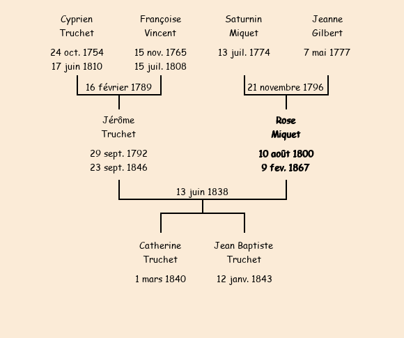 Le mariage avec Jérome Truchet a été renouvelé à Fontcouverte le 17 novembre 1838 avec dispense d'empêchement de 3° et 4° degré de consanguinité. |