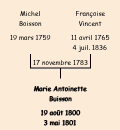 Père : Michel Buisson, fils de Jean Baptiste | Parrain : Sébastien Vincent (fils du dit Pierre) |
