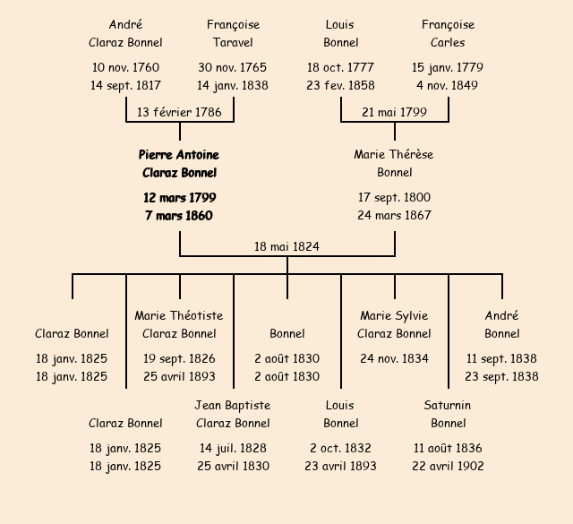 Père : André Claraz Bonnel, fils de Michel | Parrain : Pierre Antoine Sibué (fils de Saturnin) |