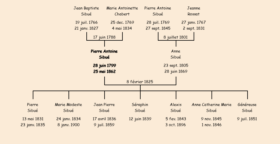 Epoux : Pierre Antoine Sibué, fils de Jean Baptiste et de Marie Antoinette Chabert |