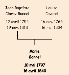 Père : Jean Baptiste Bonnel, fils de Michel | Parrain : Jean Pierre Bullière (fils de Pierre Antoine) |