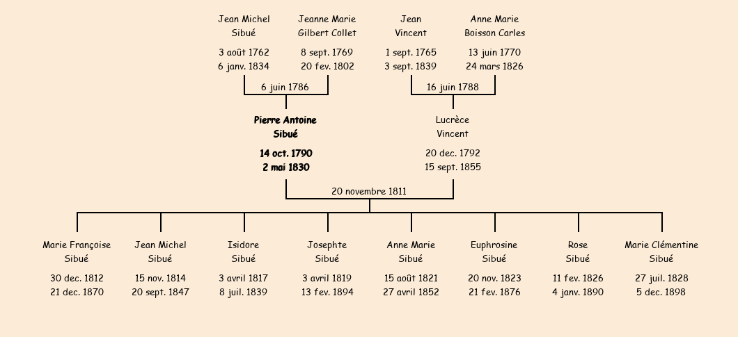 Epoux : Pierre Antoine Sibué, fils de Jean Michel et de feue Jeanne Marie Collet |