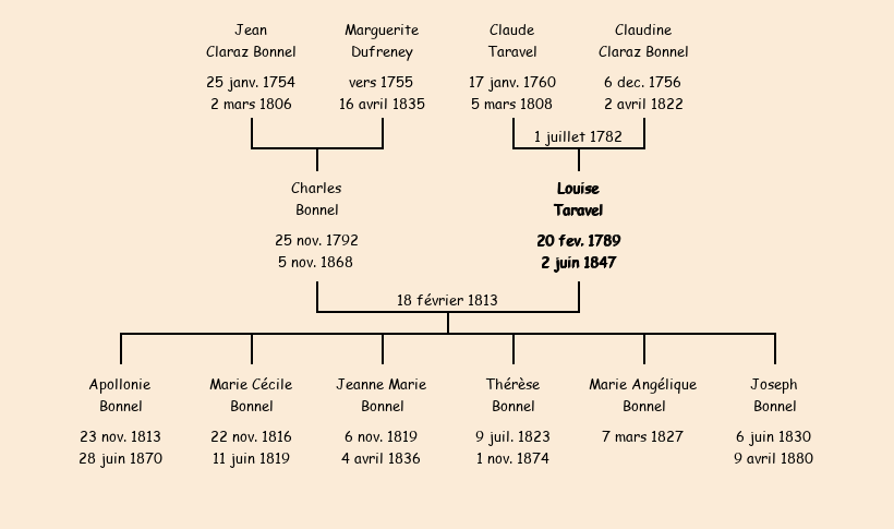 Epouse : Louise Taravel, fille de feu Claude et de Claudine Bonnel |