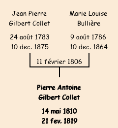 Père : Jean Pierre Gilbert Collet, fils de Antoine | Parrain : Pierre Antoine Bullière (grand-père maternel fils Pierre) |
