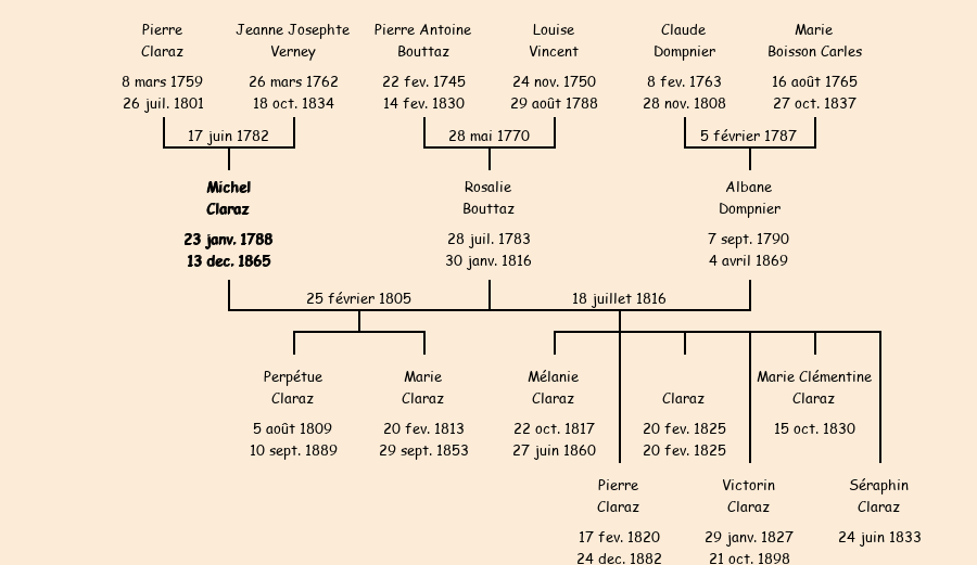 Epoux : Michel Claraz (veuf de Rosalie Bouttaz), fils de feu Pierre et de Jeanne Josephe Verney |