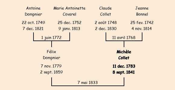Epoux : Félix Dompnier (veuf de Virginie Roche), fils de feu Antoine et de feue Marie Antoinette Covarel |