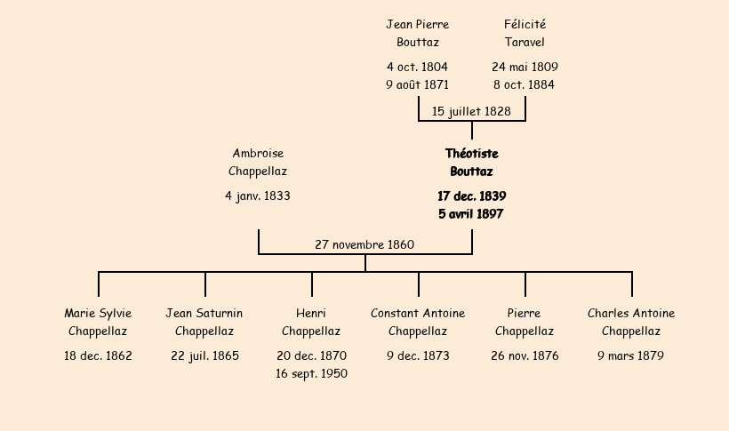 Epouse : Théotiste Bouttaz (20 ans, a marqué), fille de Jean Pierre (a signé) et de Félicité Taravel |