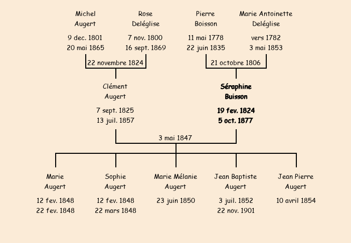 | Epouse : Séraphine Buisson (23 ans, a marqué), fille de feu Pierre et de Marie Antoinette Deléglise (a marqué) |