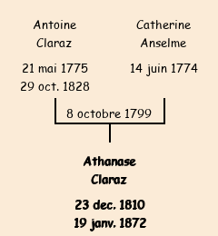 Père : Antoine Claraz, fils de Michel | Parrain : Michel Anselme (fils de Gaspard décédé, frère de la mère) |