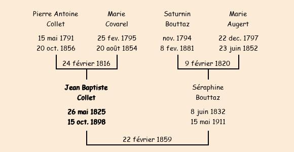 Marié (33 ans) avec Séraphine Bouttaz (26 ans) le 22 février 1859 à Fontcouverte ![]() |