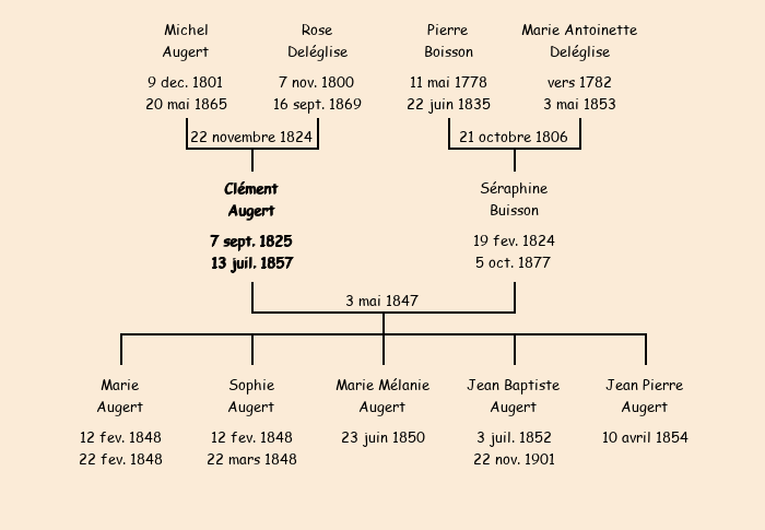 Epouse : Séraphine Buisson (23 ans, a marqué), fille de feu Pierre et de Marie Antoinette Deléglise (a marqué) |
