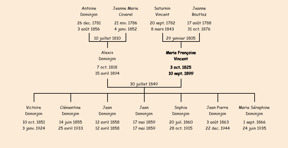 Epouse : Marie Françoise Vincent (24 ans, a marqué), fille de feu Saturnin et de Jeanne Bouttaz (a marqué) |
