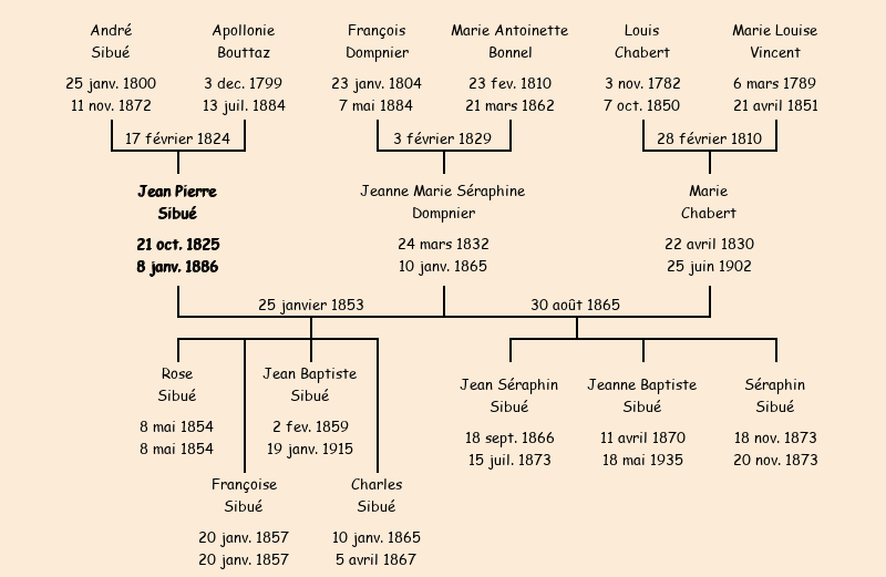 Epoux : Jean Pierre Sibué (36 ans, né le 21 octobre1828, cultivateur à La Bise, veuf de Jeanne Marie Séraphine Dompnier décédée le 10 janvier 1865, a signé), fils de André (cultivateur à la Bize, a signé) et de Apollonie Bouttaz (ménagère, n'a pas su signer) |