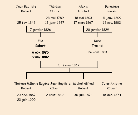 Epoux : Elie Robert (41 ans, né le 6 novembre1825, cultivateur à Riortier Dessous, a signé), fils de Jean Baptiste (décédé le 25 février1848) et de Thérèse Claraz (ménagère, n'a pas su signer) |