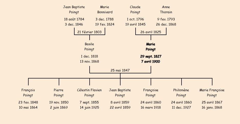 | Epoux : Basile Poingt (29 ans, a marqué), fils de feu Jean Baptiste et de feue Marie Bonnivard |