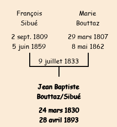 Père : François Sibué, fils de Jean Baptiste | Parrain : Saturnin Bouttaz (fils de Jean) |