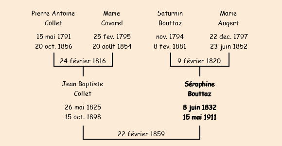 Epouse : Séraphine Bouttaz (26 ans, a marqué), fille de Saturnin (a signé) et de feue Marie Augert |