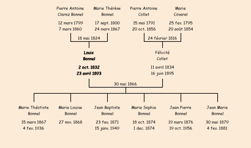 Epoux : Louis Bonnel (33 ans, né le 2 octobre1832, cultivateur à La Bise, a signé), fils de Pierre Antoine (décédé le 7 mars1860) et de Marie Thérèse Bonnel (ménagère, n'a pas su signer) |