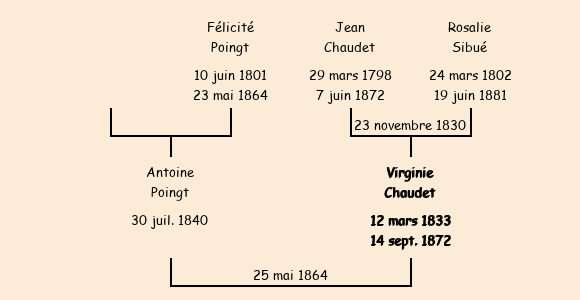 Epouse : Virginie Chaudet (31 ans, née le 12 mars1833,du Suel, cultivatrice, n'a pas su signer), fille de Jean Pierre (cultivateur, a signé) et de Rosalie Sibué (ménagère, n'a pas su signer) |
