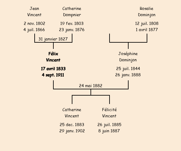 Epoux : Félix Vincent (49 ans, né le 17 avril1833, cultivateur au Chef Lieu, a signé), fils de Jean (décédé le 4 juillet1866) et de Catherine Dompnier (décédée le 24 février1875 (1876)) |